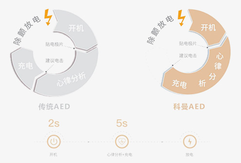 當(dāng)患者出現(xiàn)心臟驟停時(shí),黃金搶救時(shí)間只有4分鐘,分秒必爭(zhēng)。科曼AED在心律分析過程中同步智能預(yù)充電縮短了開機(jī)和心律分析的時(shí)間,開機(jī)到充電完成全程不超過7秒,心律分析完成時(shí)即刻可以進(jìn)行放電。